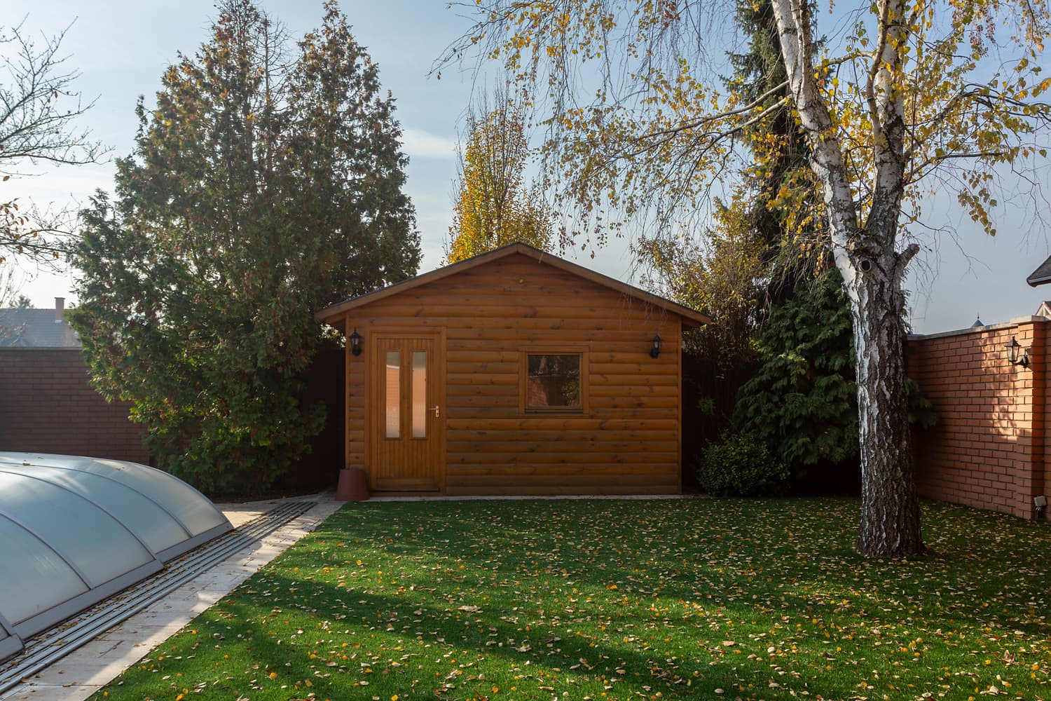 Praktikus faház a kert hátsó részében, amely kiválóan alkalmas kerti eszközök és medencéhez szükséges felszerelések tárolására. A zöld pázsit és a gondozott környezet kellemes hangulatot biztosít.
