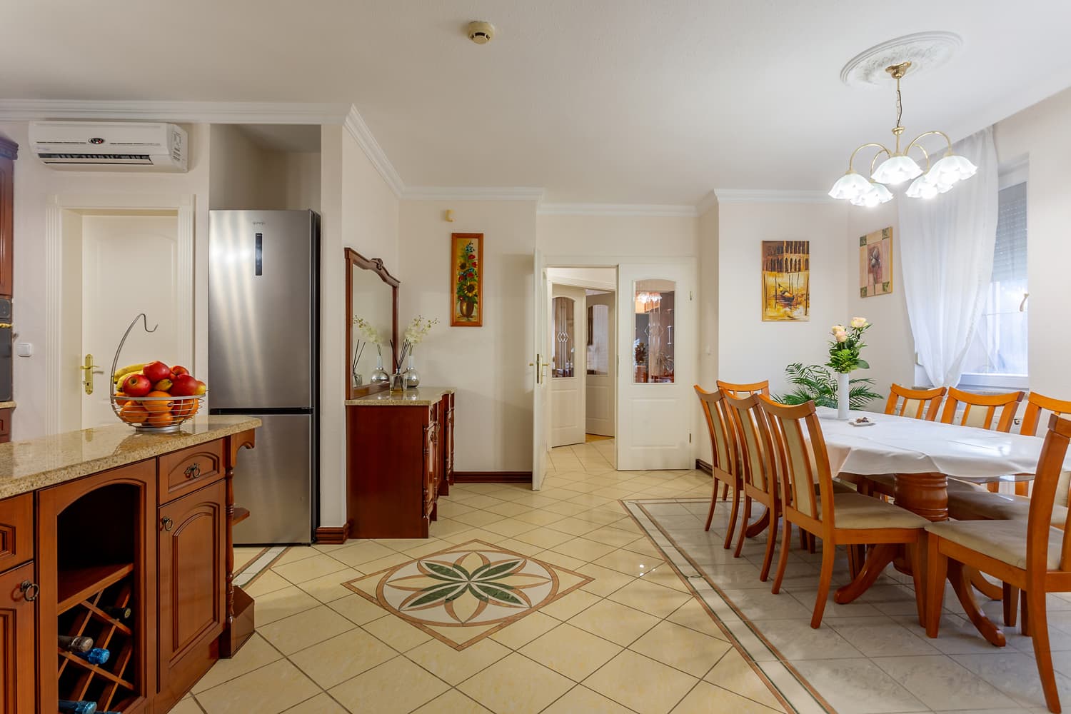Tágas és világos étkező modern felszereltséggel, amely tökéletes helyszínt kínál a családi étkezésekhez. A klasszikus bútorok és finom részletek harmonikus eleganciát sugároznak.