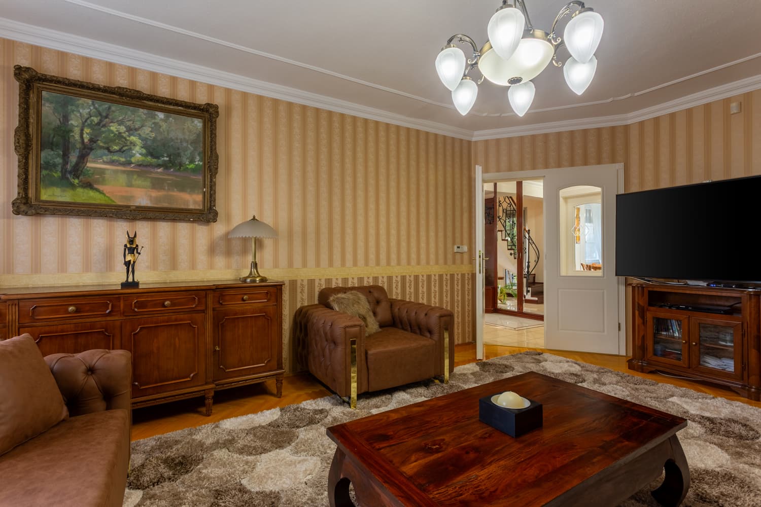 Klasszikus nappali elegáns berendezéssel, amely kifinomult hangulatot áraszt. A természetes anyagok és a részletek harmóniája időtálló eleganciát biztosít.