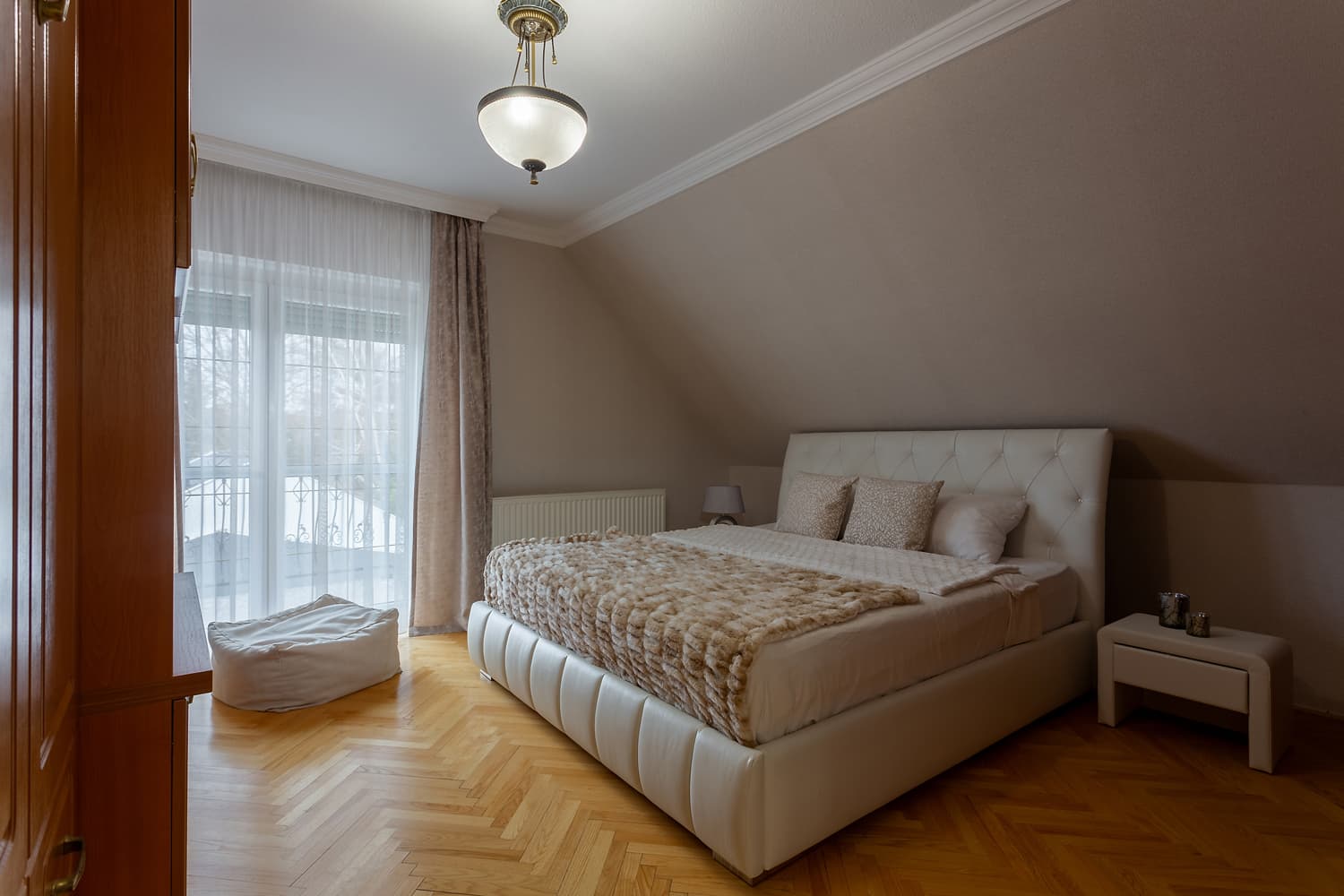 Stílusos és kényelmes hálószoba részlet, amely elegáns és nyugodt környezetet teremt a pihenéshez. A puha textíliák és a letisztult színvilág tökéletes harmóniát sugároznak.