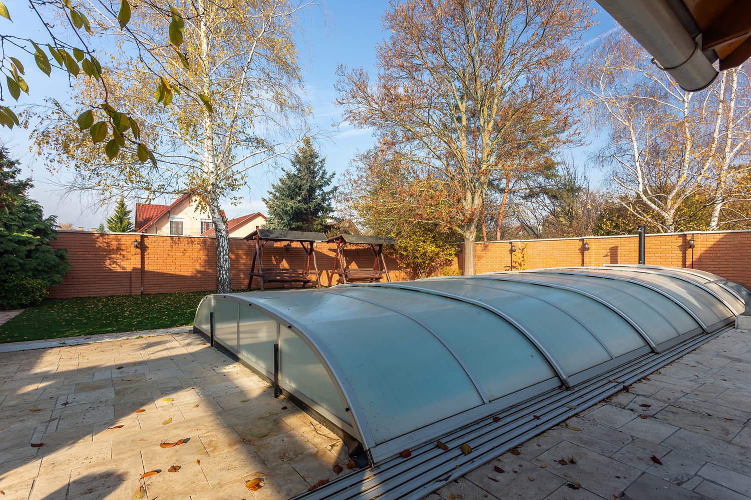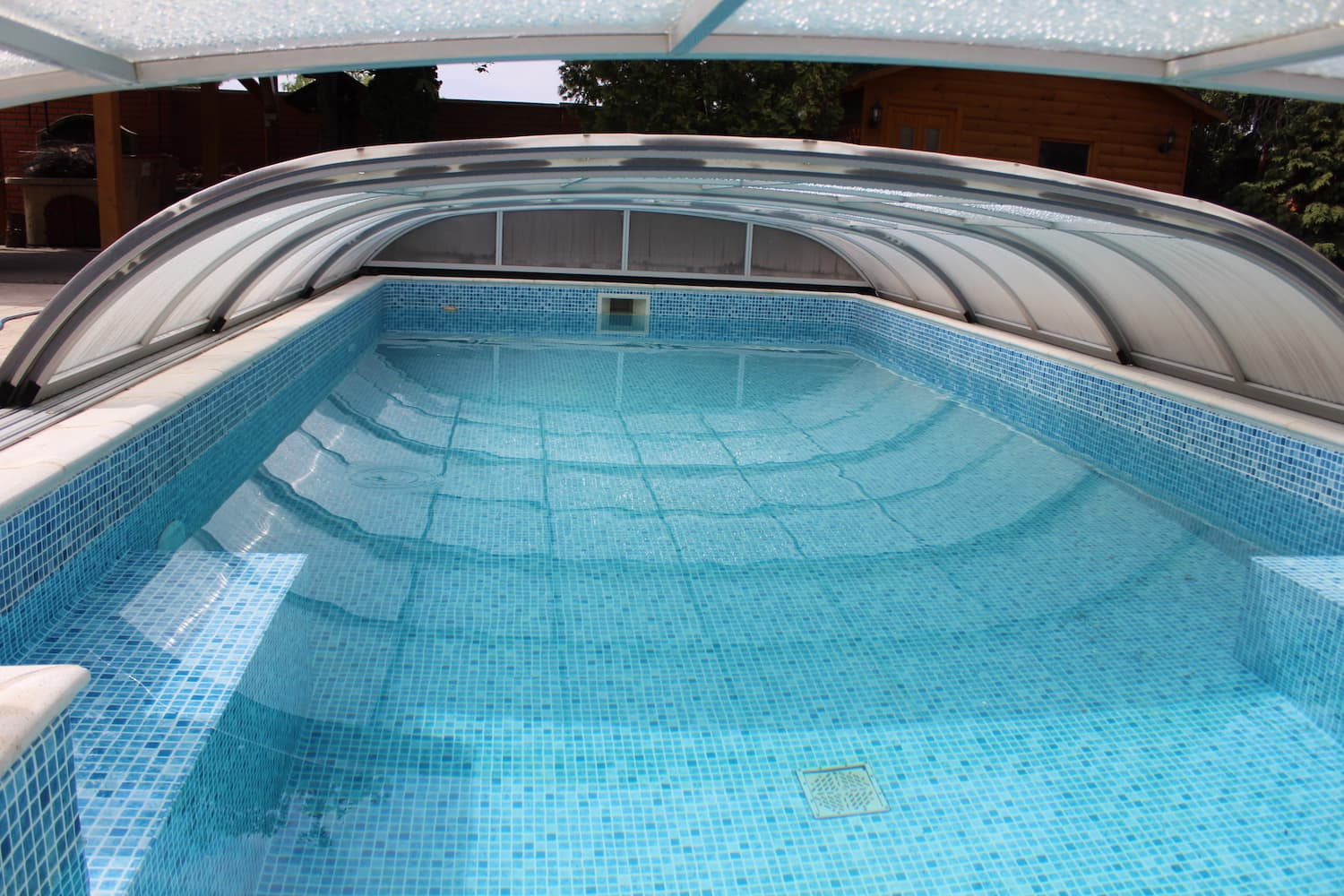 Modern, fedett medence kristálytiszta vízzel, amely minden évszakban ideális kikapcsolódást kínál. A letisztult kék mozaikcsempe és a praktikus medencefedés hosszú távú használhatóságot biztosít.