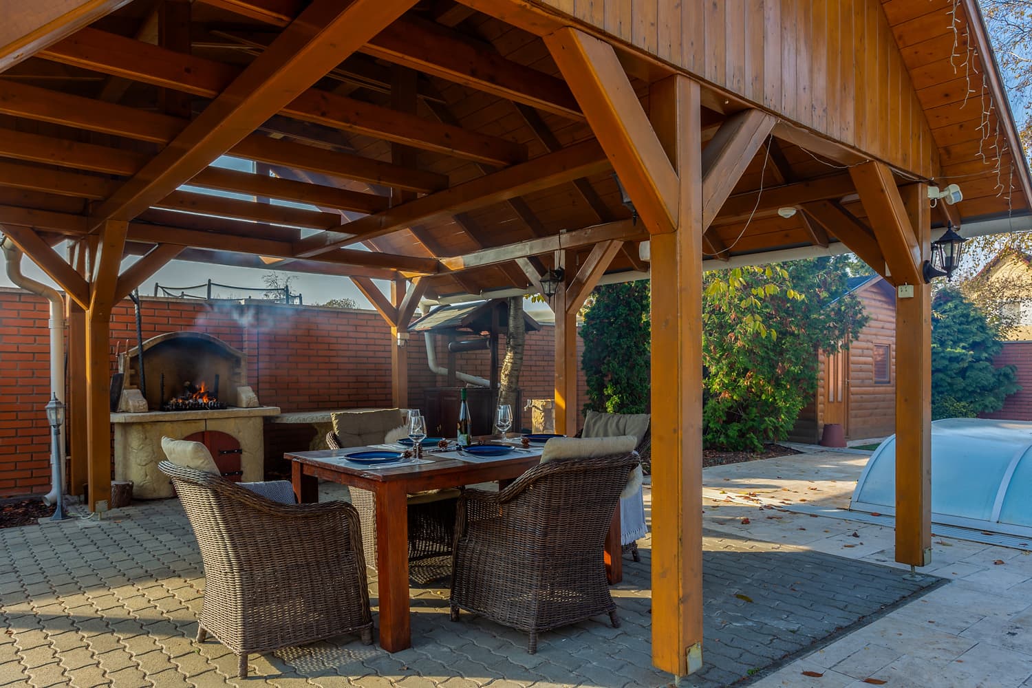 Hangulatos kerti pihenőhely, amely ideális családi és baráti összejövetelekhez. A természetes anyagok és praktikus kialakítás kényelmes kikapcsolódást nyújt.