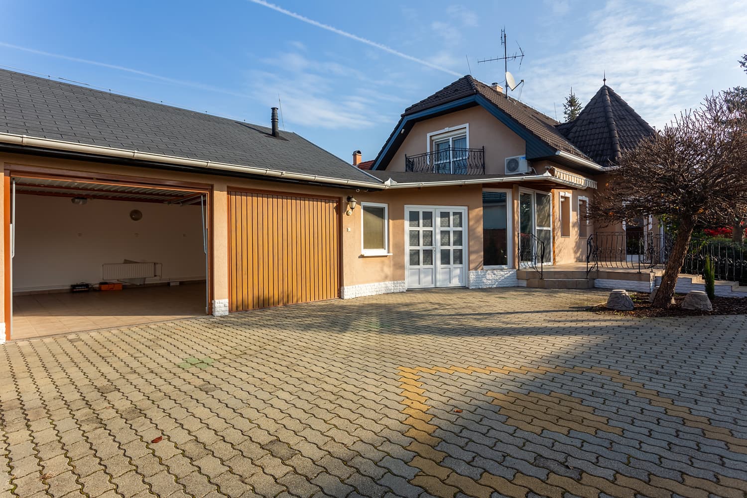 Tágas, dupla garázs modern kialakítással, amely kényelmes parkolási lehetőséget biztosít. A térburkolt felület és a fa garázskapuk harmonizálnak a ház stílusával.